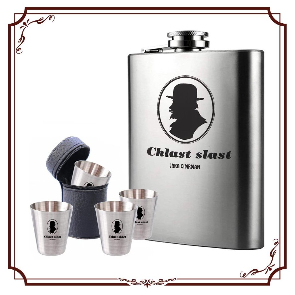 Společník pro badatele, poutníky i domácí kutily, kteří se nebojí slepých uliček ani prázdných lahví. Elegantní sada placatky a čtyř nerezových kalíšků v koženém pouzdře, nesoucí podobiznu Járy Cimrmana a jeho notoricky známého hesla „Chlast–Slast“.
